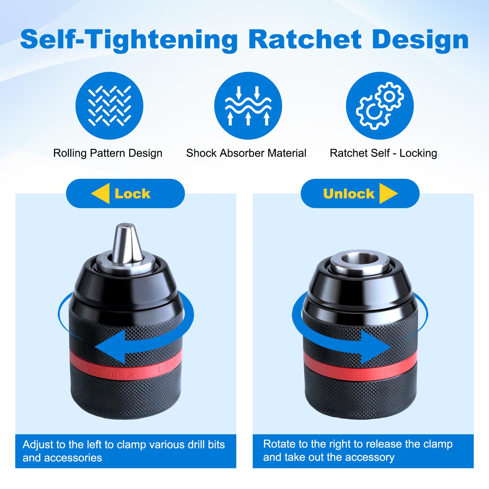 - 【UPGRADED SELF-TIGHTENING JAWS】: Upgraded carbide-tipped jaws and optimized internal mechanism provide a powerful bite on bits from 1.5mm to 13mm, minimizing slippage. The self-tightening design ratchets audibly for secure holding without jamming