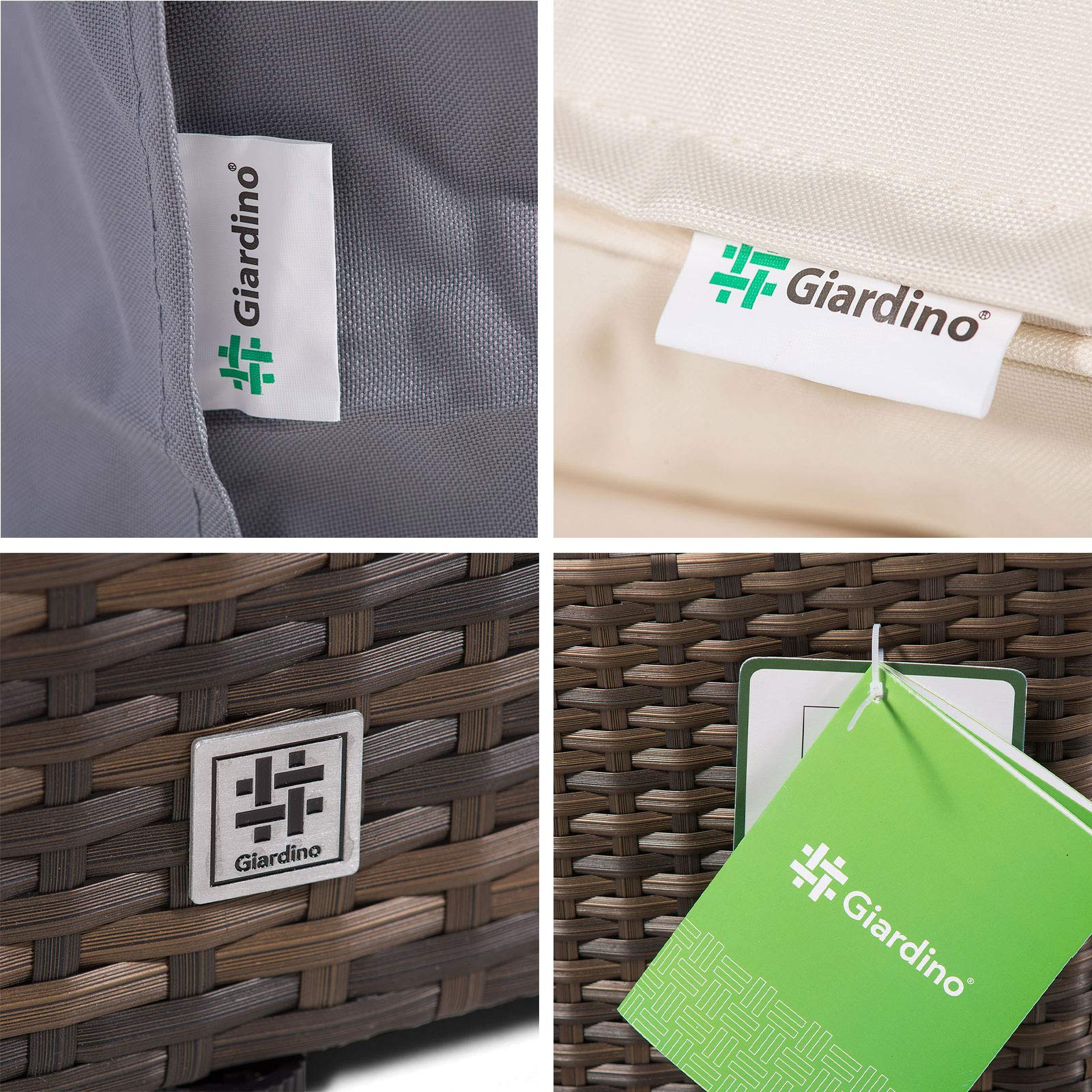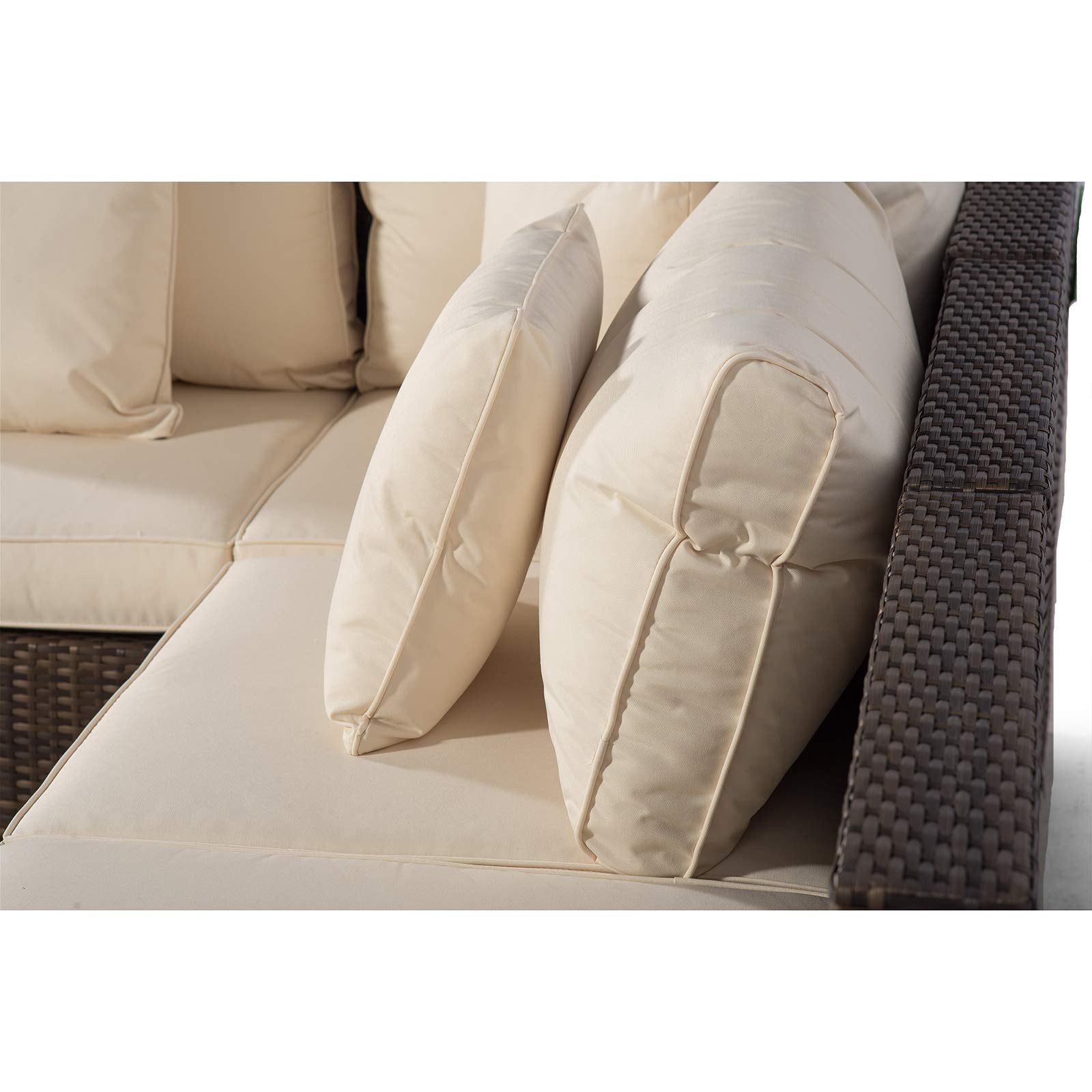 - COMFORT & LUXURY - Giardino rattan garden furniture features multi-density foam and fiber padded cushions making this outdoor rattan sofa set super comfortable. Featuring 10cm thick seat cushions and 20cm thick back cushions, the multi density fillings enhance the shape and structure providing comfort and support to your garden corner sofa. Our special water-resistant fabrics protect your rattan garden sofa set cushions from showers and all cushions feature removable covers for easy maintenance