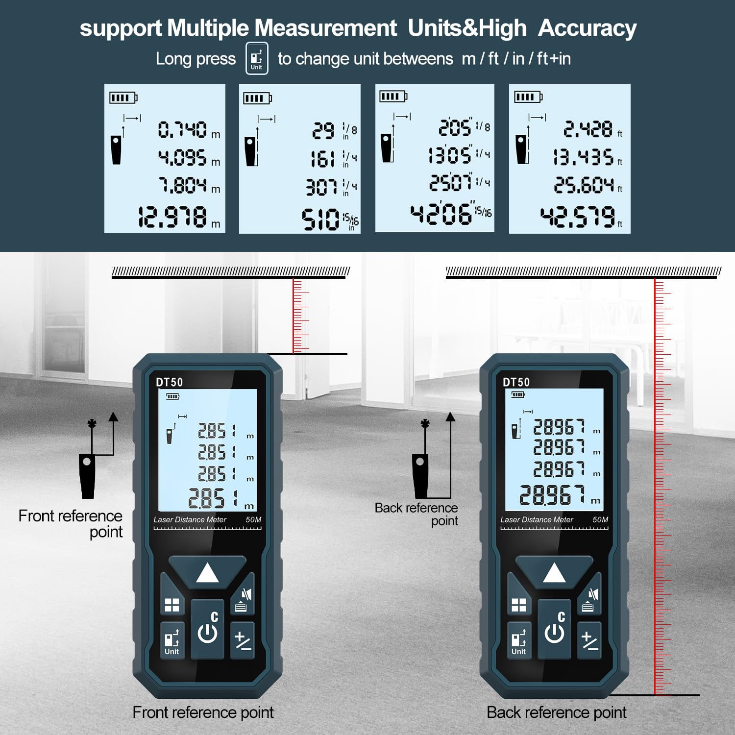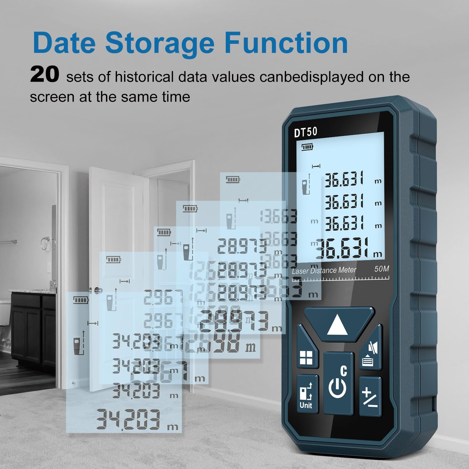 - 📌DT50 Laser Distance Meter ➤Max measurement range: 0.2-50m; Accuracy: ±2.0mm+Effective Distance * 0.00005; 20 data storage groups; One-click switch units (meter, inch and foot).