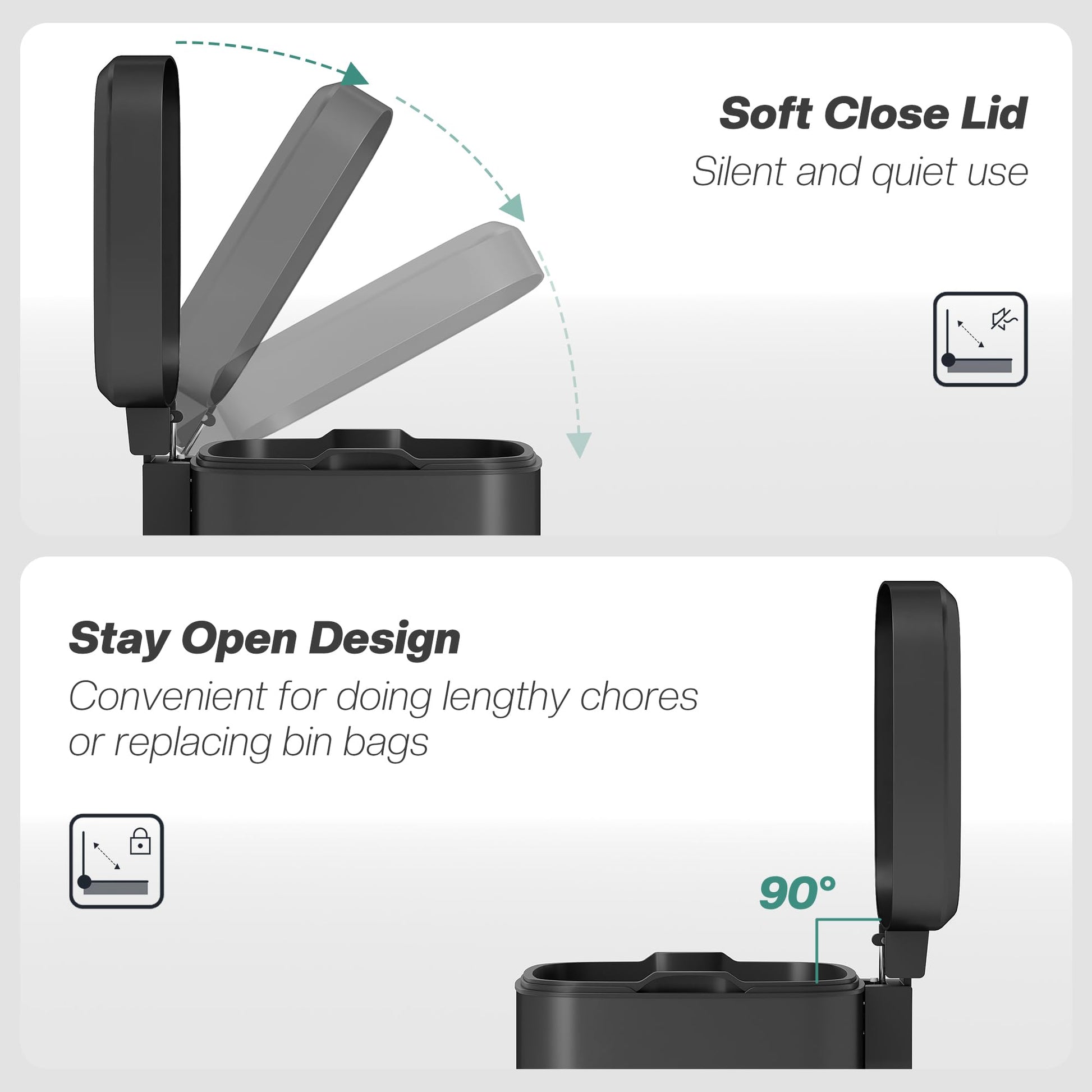 - Pedal opening, with soft-close lid: Simply press to open the lid of this rubbish bin. Gently closes so it doesn't disturb your family.