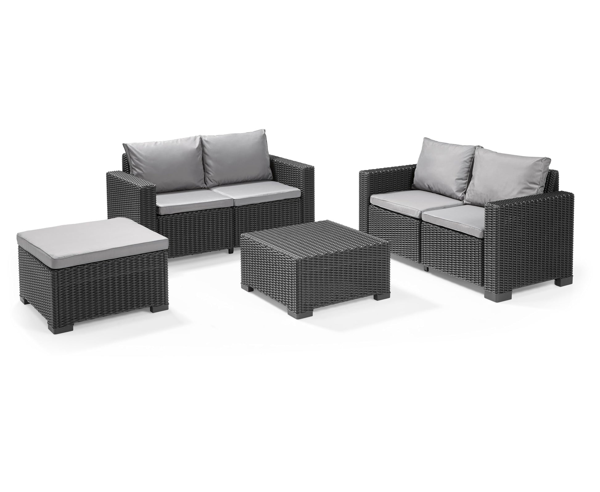 - Built for comfort with a cushion thickness of upto 7.5cm the California longue set includes a x2 2 seater sofas, x1 table and x1 footstool with cushion to accommodate up to 4 people